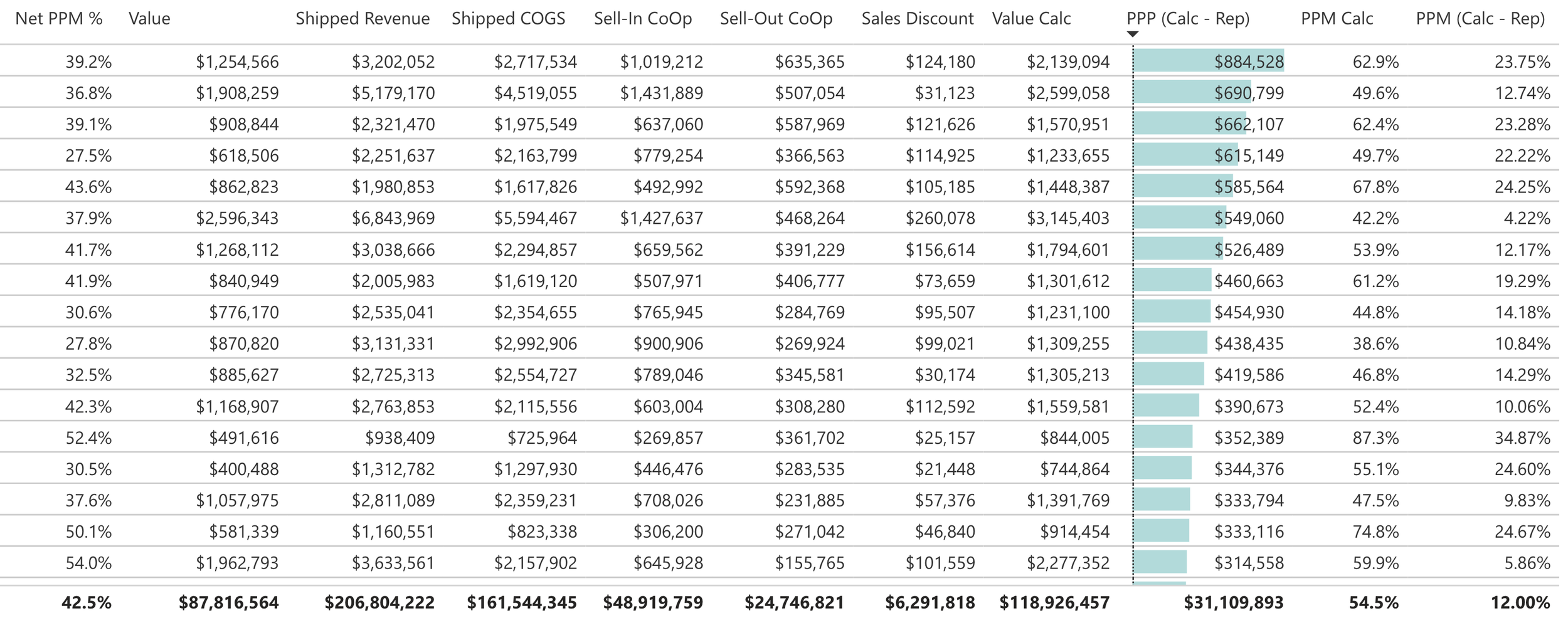 $$ \text{Net PPM} \;=\; \frac{\text{Shipped Revenue} - \text{Shipped COGS} + \text{ContraCOGS} - \text{Sales Discount}} {\text{Shipped Revenue}} $$